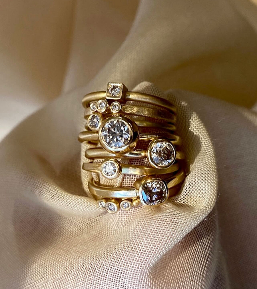 I udvalgte designs anvender jeg også champagnediamanter. Disse diamanter har en naturlig varm nuance og er valgt for deres farve og karakter frem for en klassisk farveløshed. Her er det udtrykket og samspillet med smykkets design, der er i fokus.