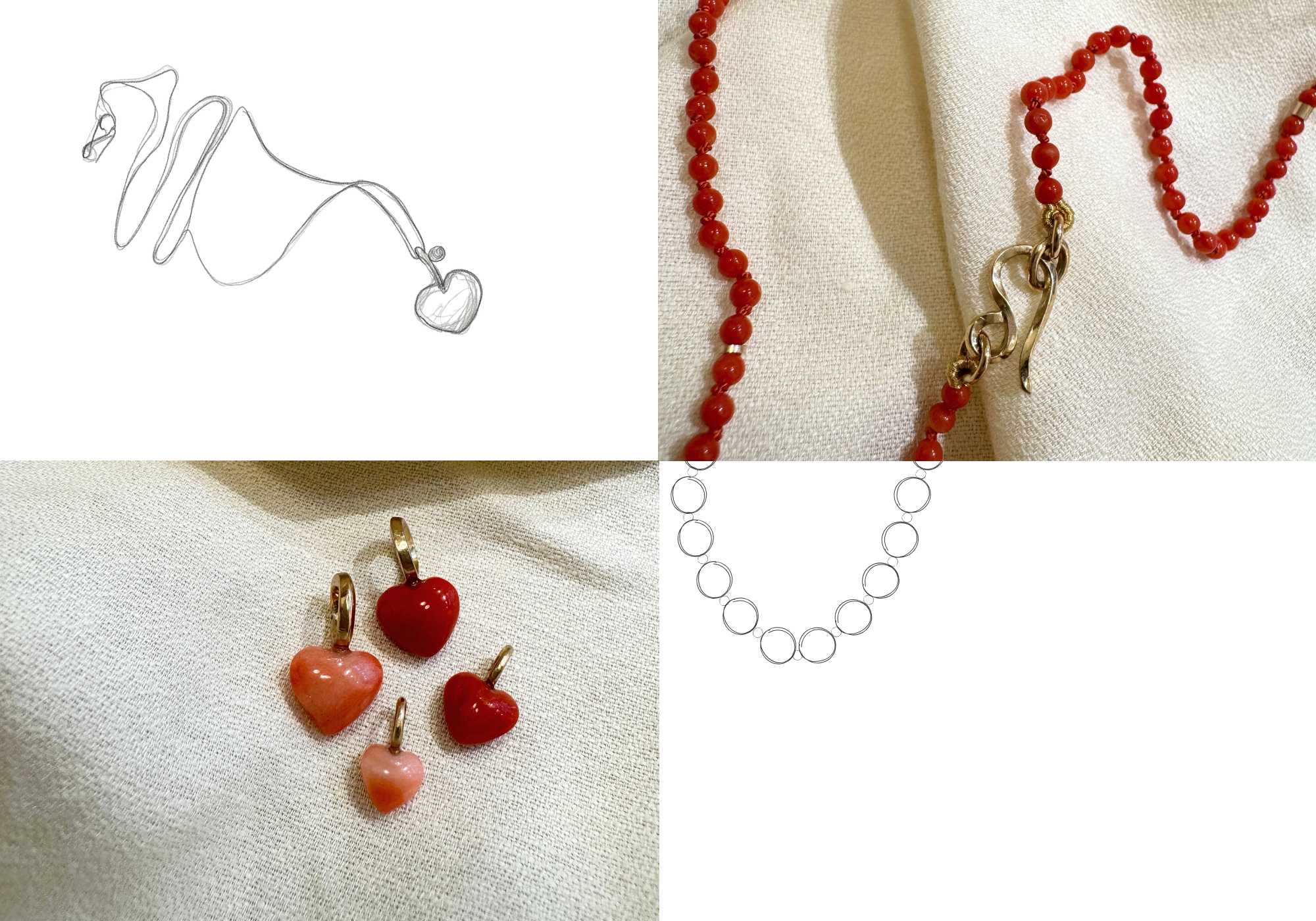 Pink coral heart in 18k gold and Nova diamond pendant No. 2 in saturn chain