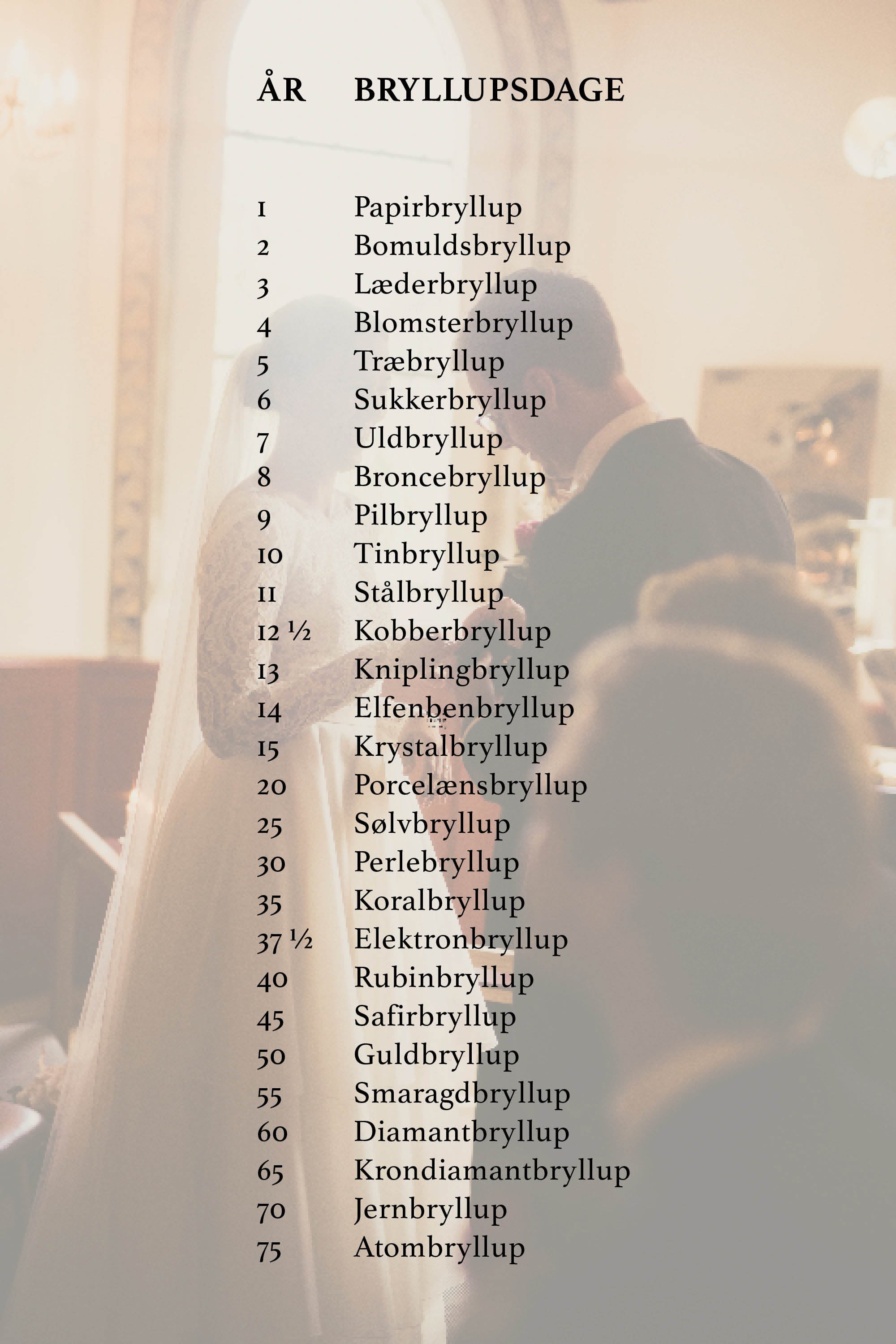 Her kan du se en oversigt for de forskellige bryllupsdage og de materialer, de repræsenterer: